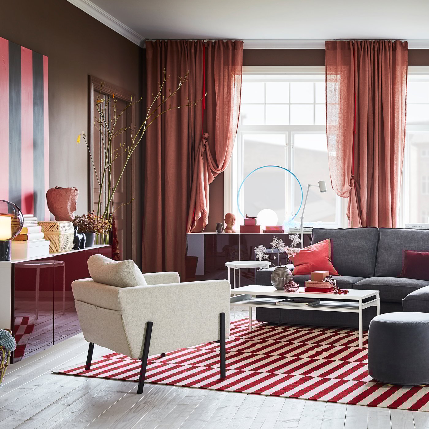Living Room In Retro Style With A White Sofa And Red Curtains