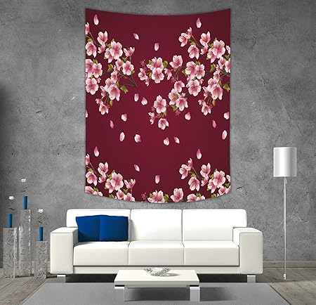 Polyester Tapestry Wall Hanging Maroon Japanese Sakura Tree
