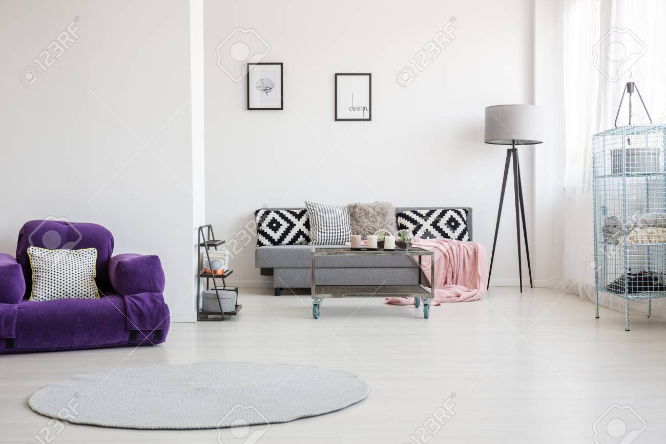 Round Rug And Purple Armchair With Decorative Pillow In Spacious