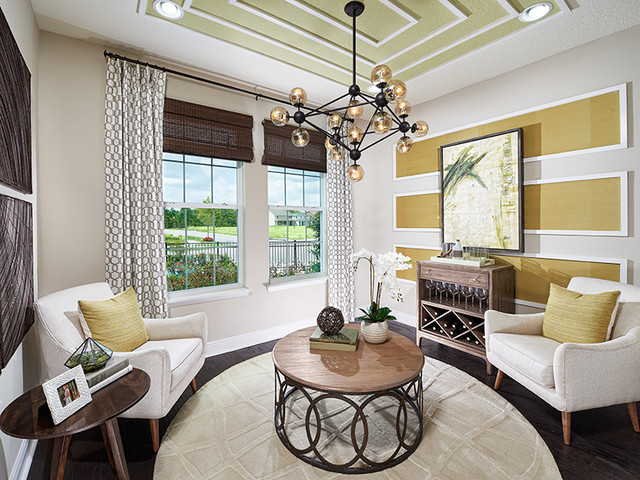 Contemporary Living Room With Grey Porcelain Tile And Soft Green